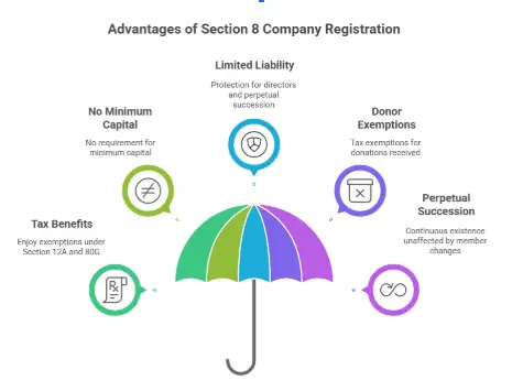 - Limited liability protection: Section 8 companies avail limited liability protection for directors, and perpetual succession, ensuring continuity beyond individual members.